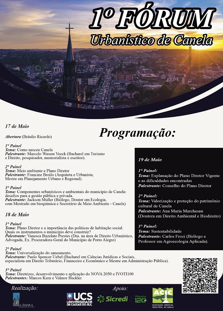 O evento contará com autoridades em âmbito municipal e estadual sobre diversos temas, e toda a comunidade canelense está convidada a participar deste, que poderá ser um grande marco para a urbanização responsável de Canela.