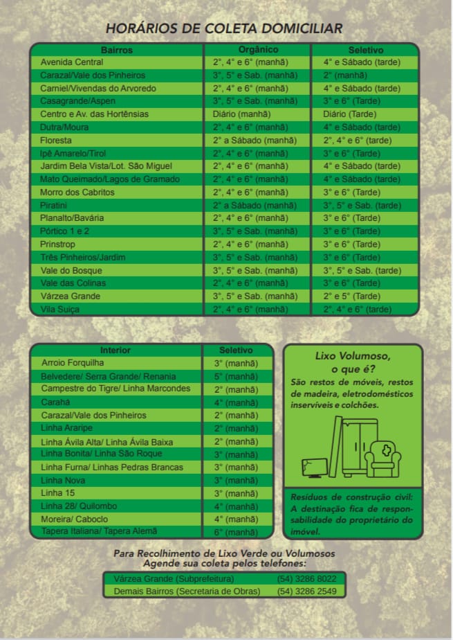 O cronograma das coletas de lixo não foi afetado. Confira os horários de coleta domiciliar no quadro.