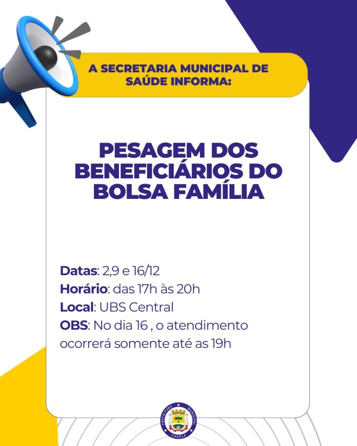 CANELA – Os beneficiários do Programa Bolsa Família poderão realizar a pesagem obrigatória na Unidade Básica de Saúde (UBS) Central nos dias 2, 9 e 16 de dezembro. O atendimento ocorrerá durante o turno estendido, das 17h às 20h. No dia 16, o atendimento ocorrerá somente até às 19h.