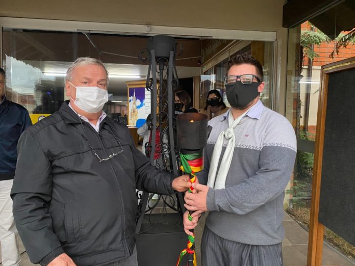 CANELA – A época do ano mais importante para o tradicionalismo gaúcho iniciou no final da tarde de ontem (7). Da pira, o prefeito Constantino Orsolin retirou uma centelha do Fogo Simbólico, acendendo o candeeiro crioulo e entregando a Chama Crioula, símbolo do amor do gaúcho pela sua terra, ao patrão do CTG Querência, Jeferson Lódea.