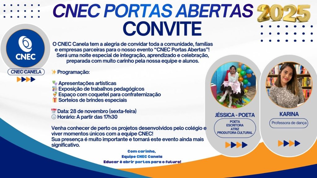 CANELA – A CNEC realiza hoje, sexta-feira (28), a partir das 17h30, o evento CNEC Portas Abertas, uma iniciativa que busca fortalecer o vínculo entre a escola, as famílias dos estudantes, empresas parceiras e a comunidade local. A programação ocorrerá nas dependências da instituição e reunirá atividades culturais, pedagógicas e de integração.