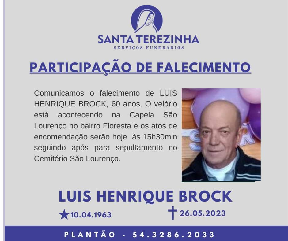 Luis Henrique Brock deixa a esposa, Maria Margarete dos Santos e as filhas, Liasiane e Letícia. O serviço funerário foi realizado pela Funerária Santa Terezinha.