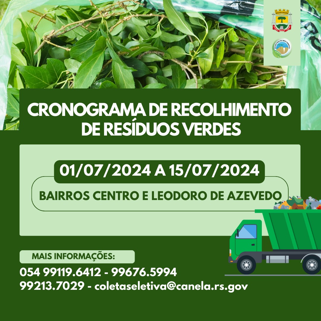 CANELA – Entre os dias 1 e 15 de julho, a Secretaria de Meio Ambiente, por meio de empresa contratada, está sendo realizado o recolhimento de resíduos verdes em dois importantes bairros da cidade: Centro e Leodoro de Azevedo.