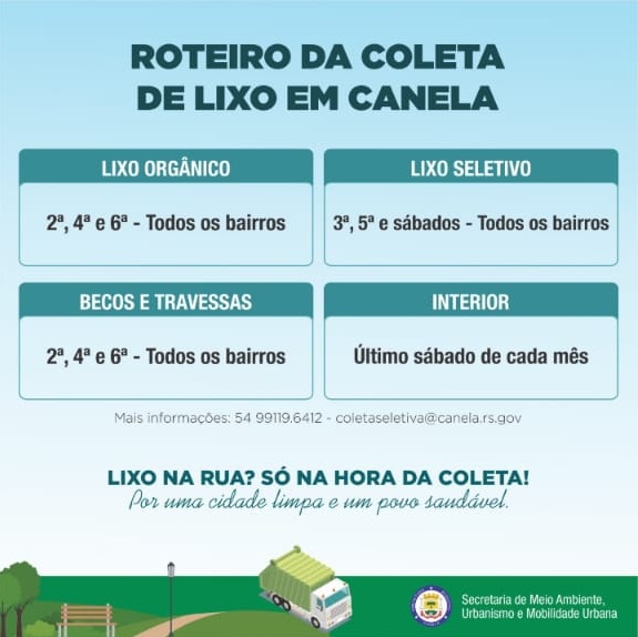 CANELA – A coleta do lixo será realizada normalmente nesta terça-feira (7), Dia da Independência do Brasil. De acordo com o calendário disponibilizado pela Prefeitura, nas terças é feita a coleta do Lixo Seletivo.