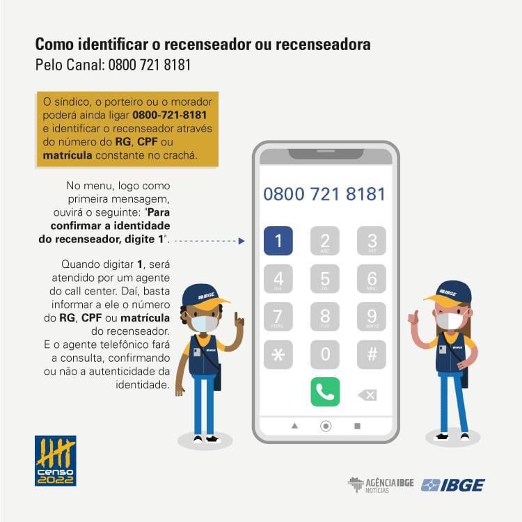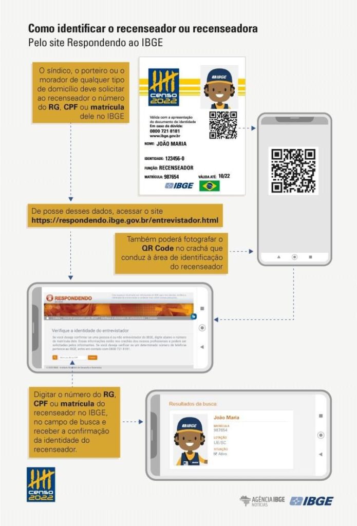 Os recenseadores estarão sempre uniformizados, com o colete do IBGE, boné do Censo, crachá de identificação e o DMC. Além disso, é possível confirmar a identidade do agente do IBGE no site Respondendo ao IBGE ou pelo telefone 0800 721 8181. Ambos constam no crachá do entrevistador, que também traz um QR code que leva à área de identificação no site.