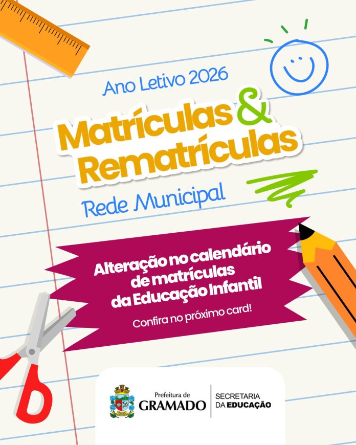 A partir do dia 02 de fevereiro de 2026, o Setor de Vagas da Educação Infantil passa a receber as inscrições de novas crianças, assim como pedidos de transferência e encaminhamentos de alunos para suas escolas. Todos esses processos podem ser solicitados através do site da Prefeitura de Gramado (gramado.atende.net) na aba “Inscrição Online”, ou por meio de atendimento presencial na Secretaria da Educação.