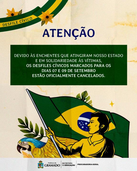 Seguindo a determinação do Governo do Estado e Exército Brasileiro, a Prefeitura de Gramado, por meio da Secretaria da Educação e Procuradoria-Geral, informa que os Desfiles Cívicos marcados para esta quinta-feira (7) no Centro e sábado (9) na Várzea Grande estão cancelados.