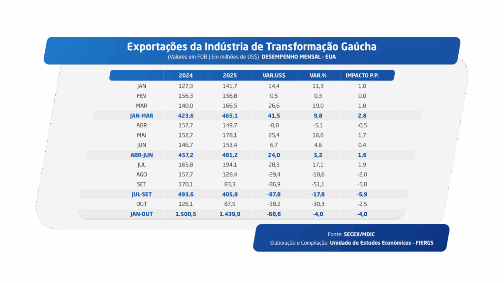Apesar da forte queda no mercado americano, o desempenho geral da Indústria de Transformação do Rio Grande do Sul foi positivo em outubro de 2025. As exportações do setor, considerando todos os destinos, alcançaram US$ 1,6 bilhão, um avanço de US$ 65,1 milhões (4,3%) em relação ao mesmo mês de 2024.