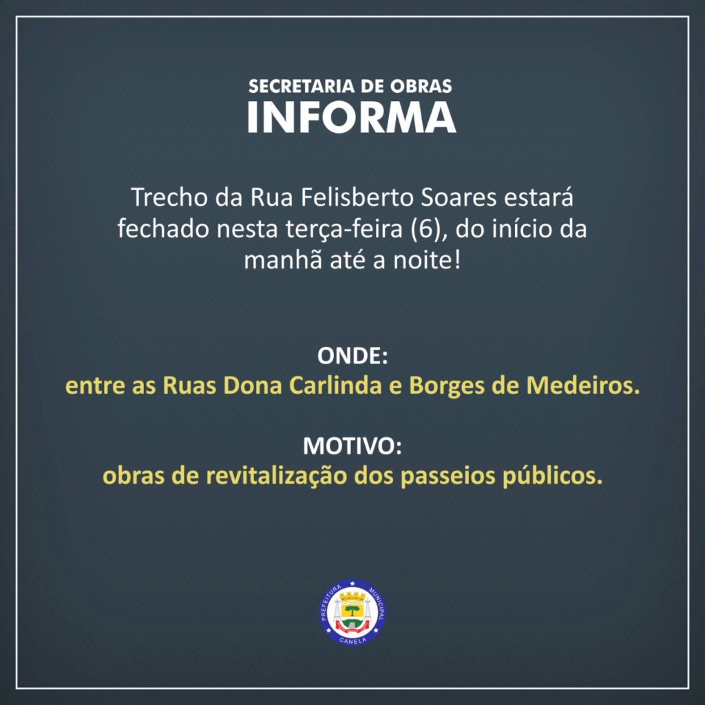 TRÂNSITO BLOQUEADO – Nesta terça-feira (6), durante todo o dia, o transito de veículo estará interrompido nos dois sentidos na Felisberto Soares entre a Dona Carlinda e a Borges e Medeiros.