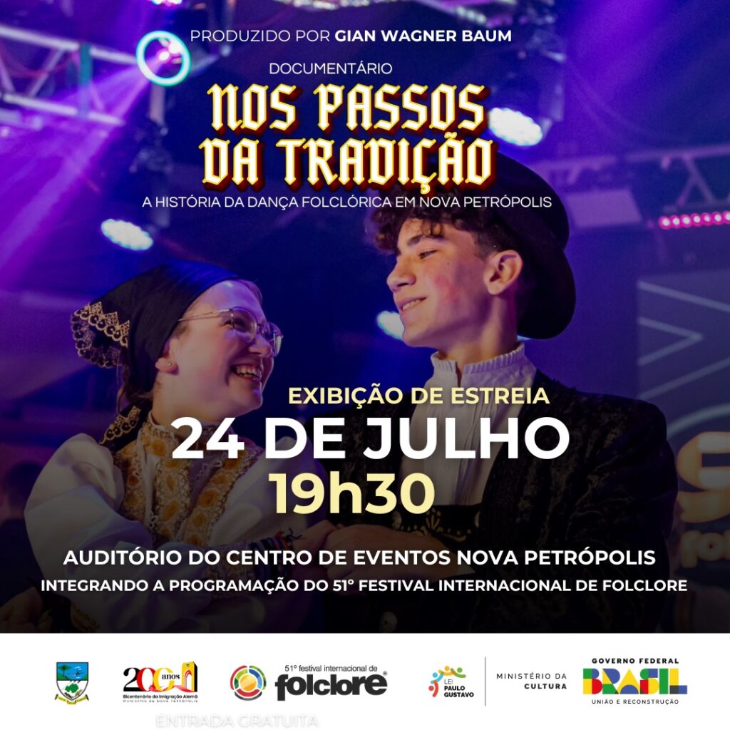 REGIÃO – O documentário ‘Nos Passos da Tradição – A história da dança folclórica em Nova Petrópolis’ terá sua exibição de estreia nesta quarta-feira (24), às 19h30, no Auditório do Centro de Eventos de Nova Petrópolis. A apresentação é gratuita e integra a programação do 51º Festival Internacional de Folclore. Esta será a primeira exibição pública do filme, que após o evento estará disponível para assistir pelo YouTube, no canal youtube.com/@passosdatradicao.