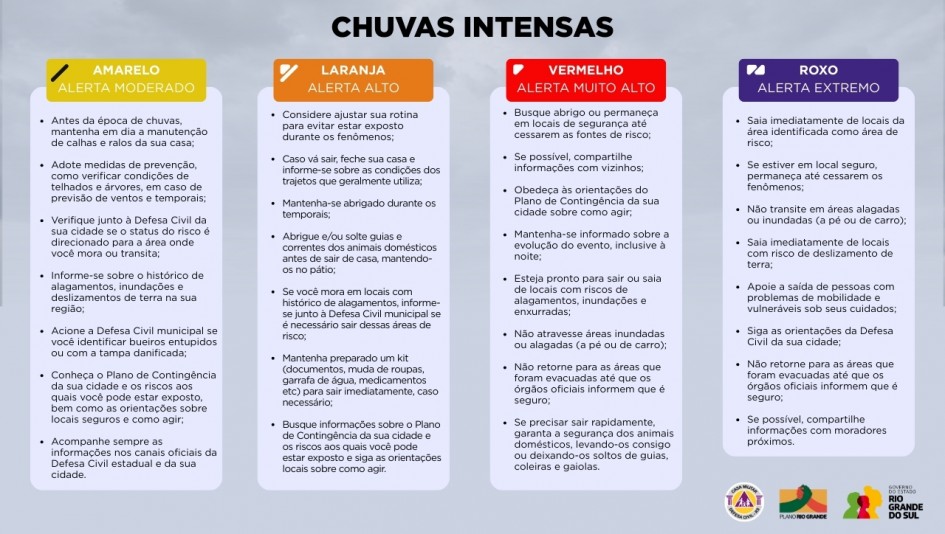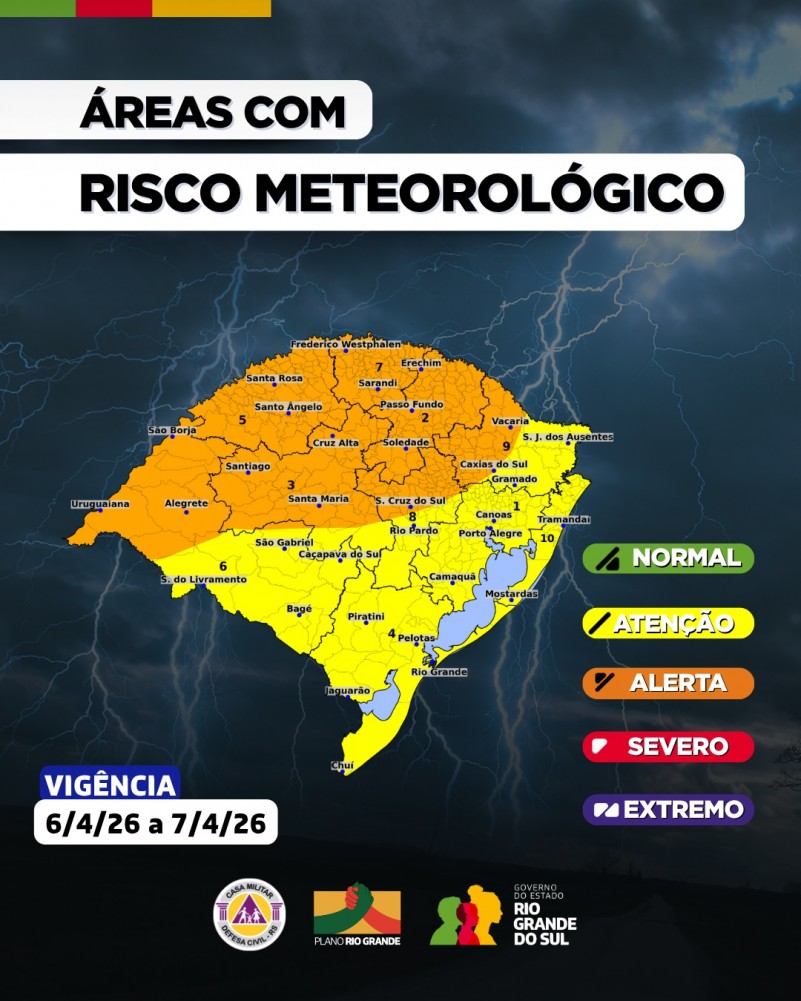 O risco de rajadas de vento intensas e chuva forte é maior a partir da noite, quando tempestades avançam pela região Oeste em direção ao Centro. Os acumulados oscilam entre 10 e 50 mm/dia, chegando pontualmente até 90 mm/dia no Oeste, Centro e Campanha. O mar fica agitado e com ressaca.