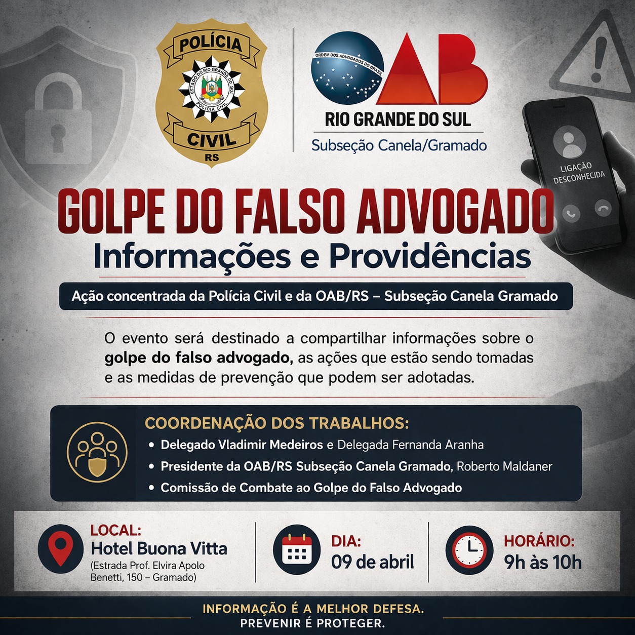 Organizado pelas Delegacias de Canela e Gramado, em parceria com a OAB Subseção Canela/Gramado, o encontro terá como foco apresentar as medidas adotadas para prevenir e reprimir fraudes praticadas por pessoas que se passam por advogados — um tipo de crime que tem causado prejuízos financeiros e insegurança à população.