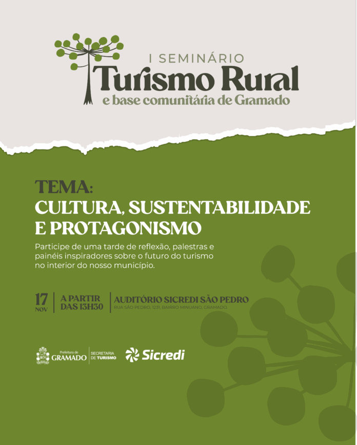 GRAMADO – A Prefeitura de Gramado, por meio da Secretaria de Turismo, realiza no dia 17 de novembro o I Seminário de Turismo Rural e de Base Comunitária de Gramado, com o tema “Cultura, Sustentabilidade e Protagonismo”. O evento acontece a partir das 13h30, no Auditório da Sicredi Pioneira Gramado São Pedro, e tem como objetivo promover a reflexão e o diálogo sobre o futuro do turismo nas comunidades do interior do município.