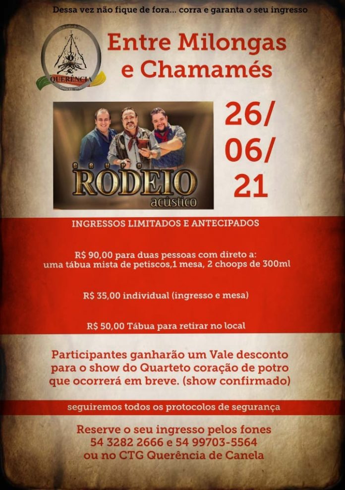 CANELA – Entre Milongas e Chamamés será atração neste sábado (26) às 20h, no Parque do Saiqui. A música será comandada pelo Grupo Rodeio que apresentará um projeto diferente no formato acústico.