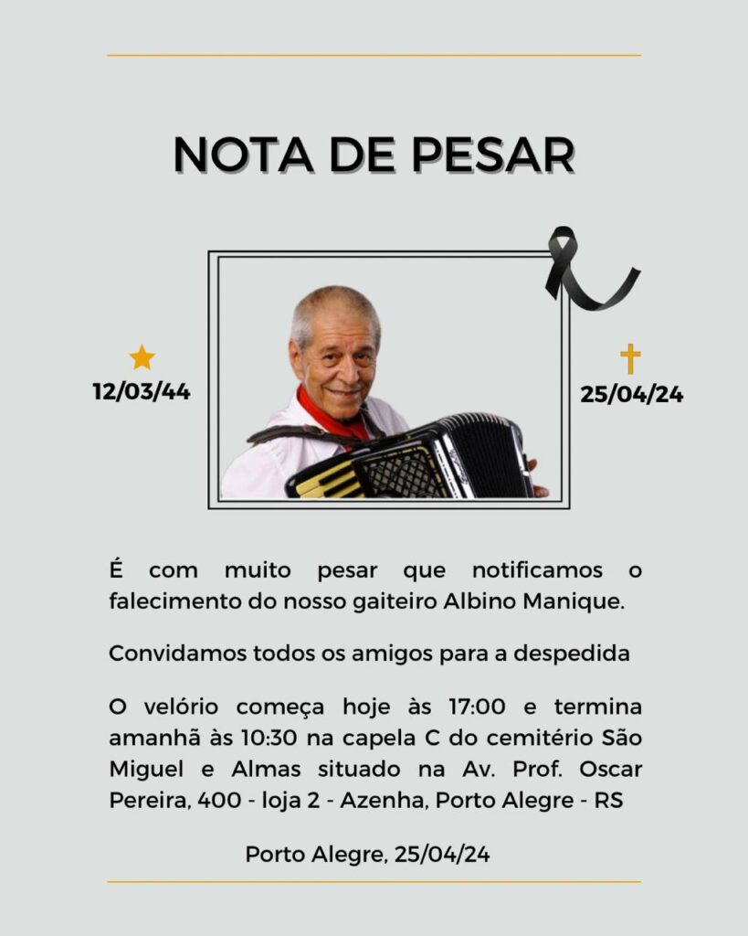 REGIÃO – Conhecido como “Mestre” ou para alguns o “Pelé da Gaita”, faleceu por volta das 8h30, na manhã desta quinta-feira (25) no Hospital da PUC em Porto Alegre, o gaiteiro Albino Manique aos 80 anos de idade. Ele estava internado para tratamento de um câncer no pulmão. Cerca de 30 dias, havia sofrido um AVC.