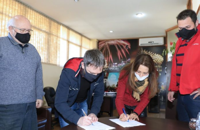 GRAMADO – A Gramadotur assinou nesta quarta-feira (21), o contrato para a realização de um novo atrativo que vai integrar a programação oficial do 36º Natal Luz: é O Reino do Natal. Participaram da assinatura a presidente da Gramadotur, Rosa Helena Pereira Volk, o diretor administrativo e financeiro da Autarquia, Jorge Bertolucci, o diretor de eventos, Diego Scariot, e Abramo Machado, da Yeah! Entretenimento.