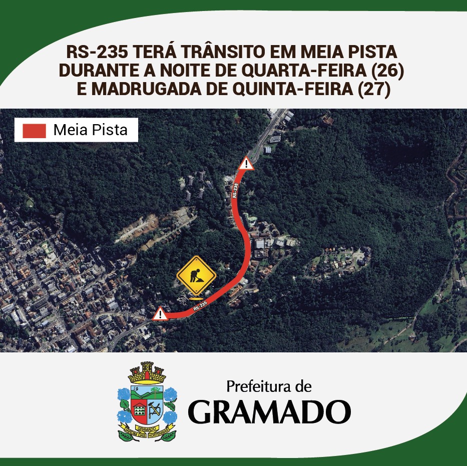 Com isso, os motoristas que transitarem pelo trecho neste horário deverão ter atenção redobrada na sinalização, próximo a rótula da Concessionária Fiat, seguindo em meia pista até o Centro de Gramado (veja mapa). A perspectiva é de que o trânsito esteja normalizado, nos dois sentidos, já na manhã de quinta-feira, sem necessidade de novos bloqueios para continuidade das obras.