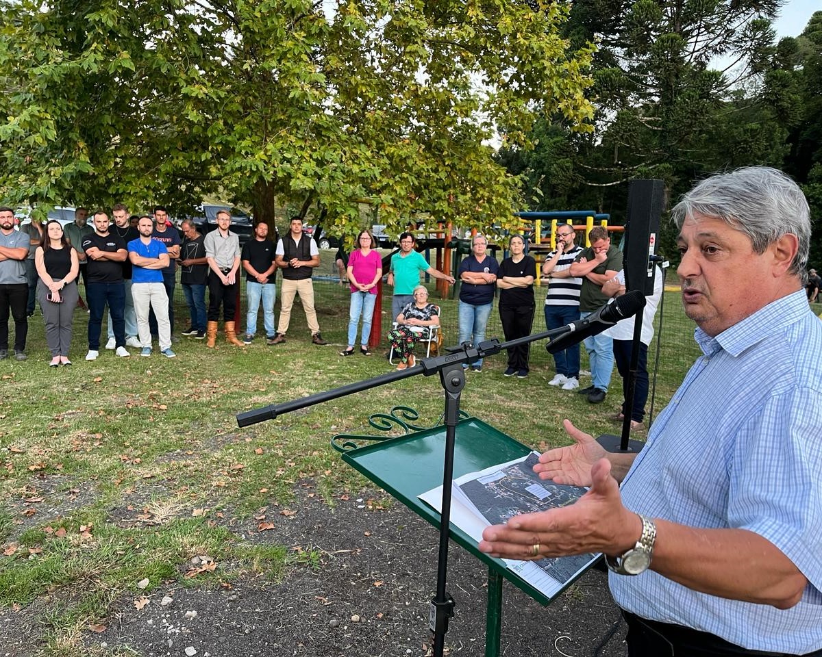 GRAMADO – A Administração Municipal promoveu um encontro com a comunidade do bairro Vale dos Pinheiros, no final da tarde da última sexta-feira (23), na praça da localidade, para anunciar um importante investimento que impactará na vida dos moradores. A reunião foi conduzida pelo secretário de Obras, Rafael Ronsoni, contando com a presença de secretários municipais, dos vereadores Joel da Silva Reis (PP), Neri da Farmácia (PP) e Rodrigo Paim (MDB), do deputado estadual Joel Wilhelm (PP), do vice-prefeito Luia Barbacovi e do prefeito Nestor Tissot, que foi o responsável pelo anúncio. “O Vale dos Pinheiros é um bairro que simboliza a família gramadense, feito por gente trabalhadora. Está recebendo infraestrutura e agora terá mais oito ruas asfaltadas”, revelou Nestor Tissot.