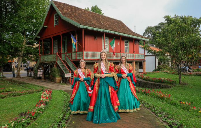 GRAMADO – A 35ª Festa da Colônia apresenta ao público os novos trajes das soberanas, inspirados nas raízes que formaram a identidade cultural do município. A rainha Erika Barbacovi e as princesas Isabela Cavalli Jung e Lisandra Mewius vestem figurinos que trazem as cores presentes nas bandeiras das três etnias responsáveis pela colonização de Gramado: italiana, portuguesa e alemã.