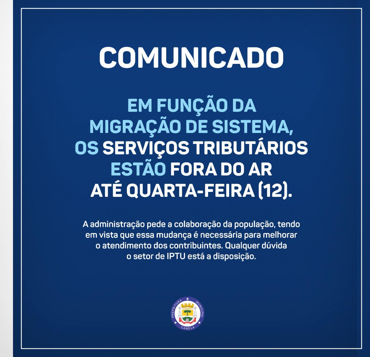 A Prefeitura de Canela informou que devido a migração do sistema, não é possível efetuar o pagamento na sede do paço municipal, mas pode ser realizado em agências lotéricas, bancos e pix. O sistema deve ser normalizado até quarta-feira (12).