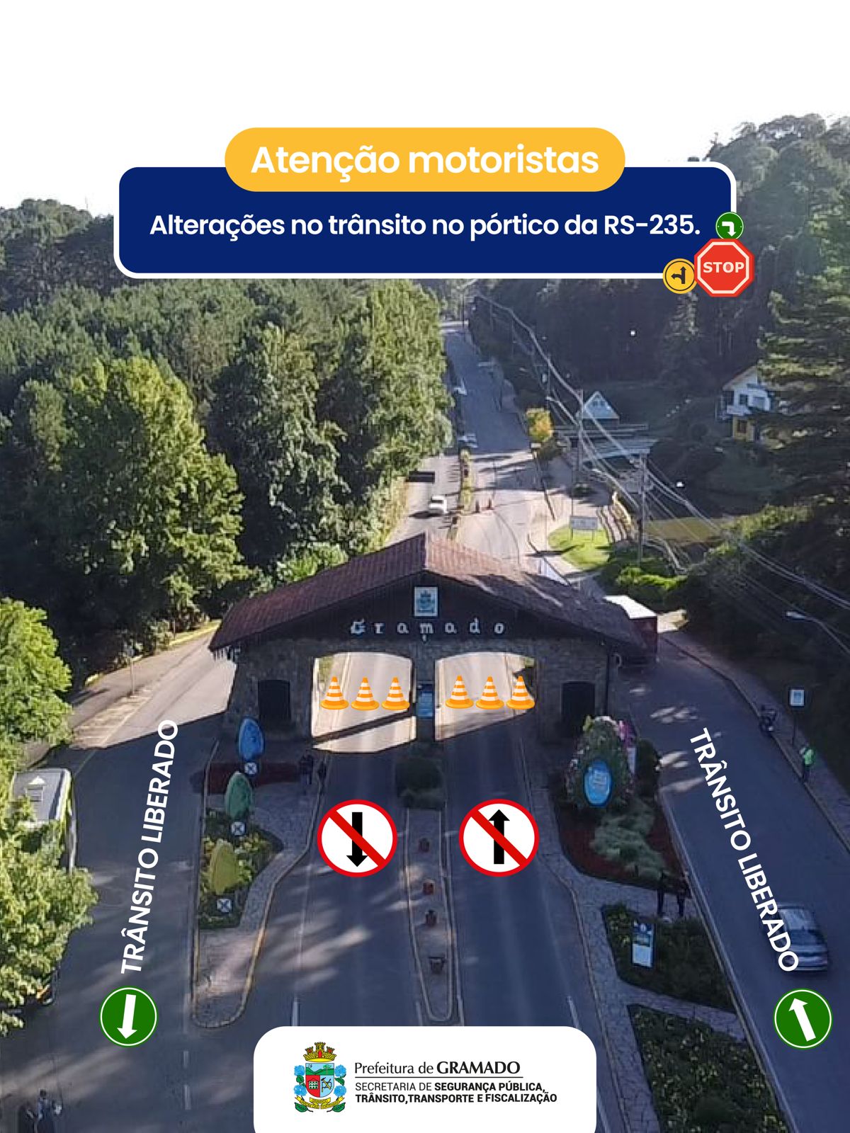 GRAMADO – A Prefeitura de Gramado informa que na manhã desta sexta-feira (10), foi suspensa, de forma temporária, a passagem de veículos sob o pórtico da ERS-235. A medida foi necessária após avaliação técnica, que constatou abalo na estrutura devido um acidente registado na noite de segunda-feira (6), quando um caminhão desrespeitou a altura permitida e colidiu contra o pórtico. O fluxo de veículos segue ocorrendo no trecho, pelas vias laterais da estrada.