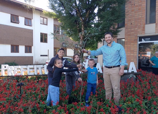 Após o cerimonial, Gilberto Cezar, acompanhado pelas crianças, colocou as mãos na terra para plantar a árvore Caneleira que dá nome ao município, junto a uma cápsula que contém mensagens homenageando Canela.