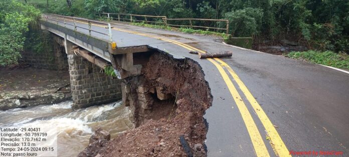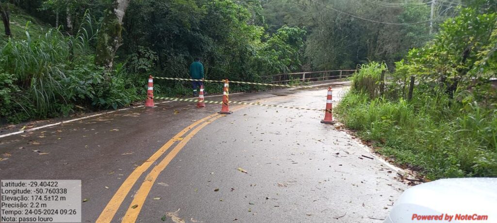 CANELA – A Secretaria de Trânsito, Transporte e Fiscalização informa que a ponte do Passo de Louro, na localidade de Amoreira, precisou ser totalmente bloqueada na manhã desta sexta-feira, 24 de maio, devido a novos problemas estruturais causados pelas fortes chuvas.