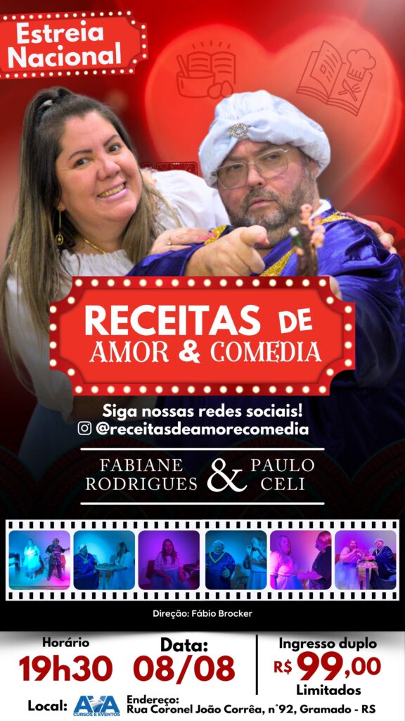 GRAMADO – Da folha de papel ao retiro espiritual e estes ingredientes para o palco, sendo transformada na peça teatral Receitas de Amor e Comédia. A atração estreia nesta quinta-feira (8), às 19h30, na sede da Ava Cursos e Eventos, na rua Coronel João Corrêa, 92, próximo à Brigada Militar de Gramado. O investimento é de R$ 99, ingresso duplo (limitado) que pode ser adquirido diretamente na sede da Ava. Mais informações (51) 99262.4139.