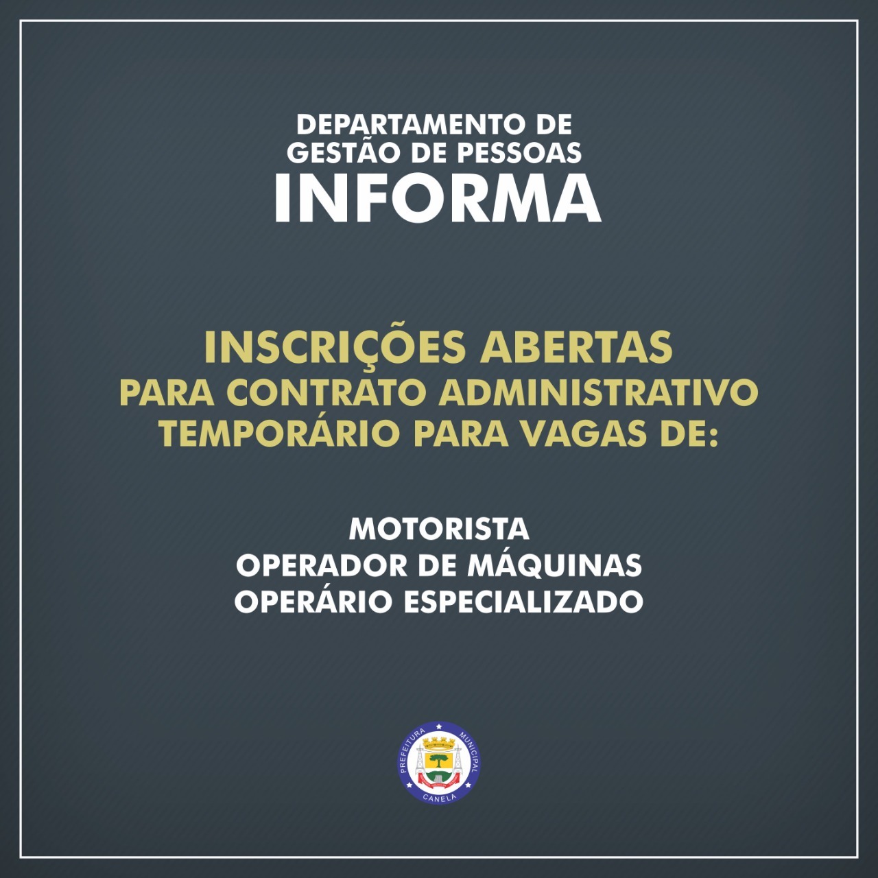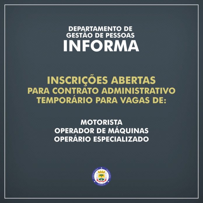 CANELA – A Prefeitura de Canela abriu inscrições para contratos administrativos de serviços temporários para o preenchimento de quatro vagas para motorista, três operador de máquinas e sete na função de operário especializado.
