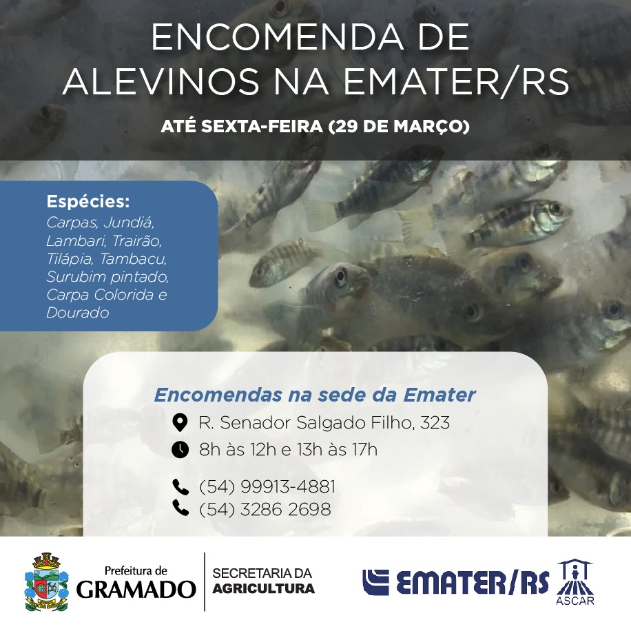 As encomendas devem ser realizadas até o dia 29 de março junto ao escritório da Emater, na R. Sen. Salgado Filho, 323, das 8h às 12h e das 13h às 17h. As espécies disponíveis são carpas, jundiá, lambari, trairão, tilápia, surubim pintado, tambacu, dourado e carpa colorida. Os alevinos são de vários tamanhos e oriundos de viveiro idôneo e licenciado. A entrega está prevista para o dia 10 de abril.