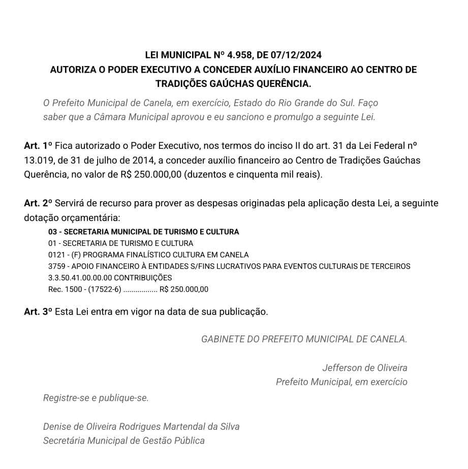 Após procurado pela reportagem do Jornal Integração, o patrão do CTG, Jeferson Lodeia, relatou que após uma conjunção de esforços com o CTG, Secretaria de Turismo e a Câmara de Vereadores foi aprovada e publicada dia 7 de dezembro a Lei Municipal 4.958/2024 que autoriza o repasse de R$ 250 mil para a realização do Rodeio, sendo R$ 100 mil oriundos da Secretaria de Turismo e R$ 150 mil através de emendas impositivas da Câmara de Vereadores.