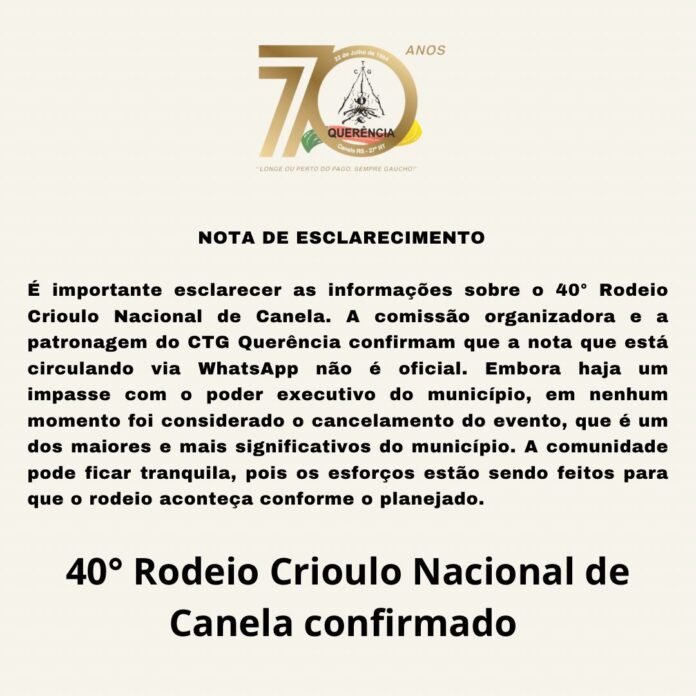 Em nota a entidade se manifestou que o rodeio será realizado de qualquer forma. “Nós programamos um evento do tamanho e com a estrutura que Canela merece. É um evento da nossa comunidade, recebemos visitantes de diversas cidades, estados e países. Esperamos que a Prefeitura cumpra com o que se propôs e não prejudique o evento, que está mais que confirmado, pois gaúcho depois que dá a palavra não volta atrás” afirma o patrão.