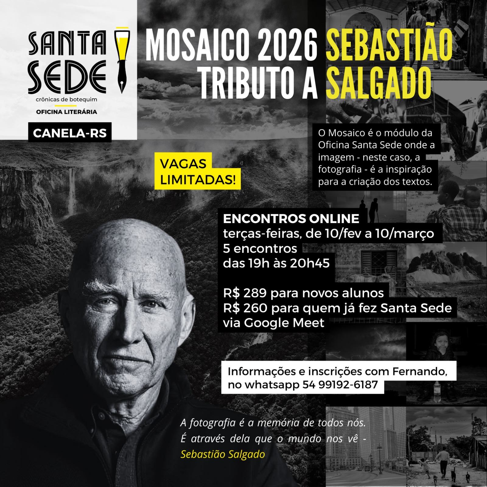 CANELA – A Santa Sede está com as últimas vagas abertas para a oficina online de escrita criativa Mosaico 2026, que neste ano presta um tributo ao fotógrafo mineiro Sebastião Salgado, considerado um dos maiores nomes da fotografia brasileira, falecido no ano passado. A atividade marca o oitavo ano de atuação da iniciativa e aposta na relação entre imagem e palavra como estímulo à produção de crônicas.