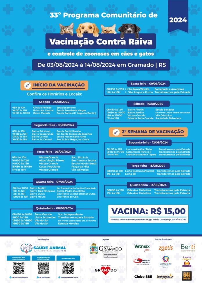 De 3 a 14 de agosto, a equipe da Saúde Animal vai estar nos bairros de Gramado em um carro especialmente preparado para vacinar os pets diretamente nas residências. Durante essa fase, a vacina será oferecida pelo valor acessível de R$ 15