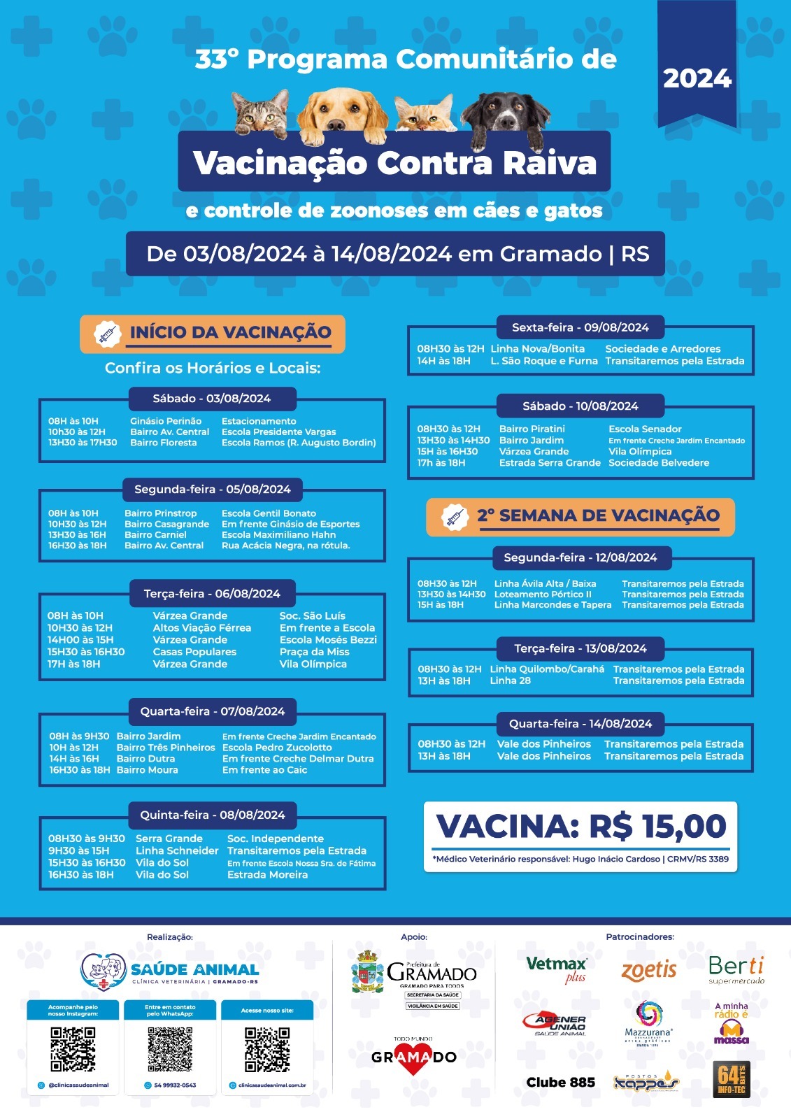 Para mais informações entre em contato com a Saúde Animal pelo WhatsApp (54) 9.9932-0543 ou pelas redes sociais. Verifique o local mais próximo da sua residência ou vá até a clínica! Aproveite essa oportunidade para proteger seu pet e contribuir para a saúde pública de Gramado.