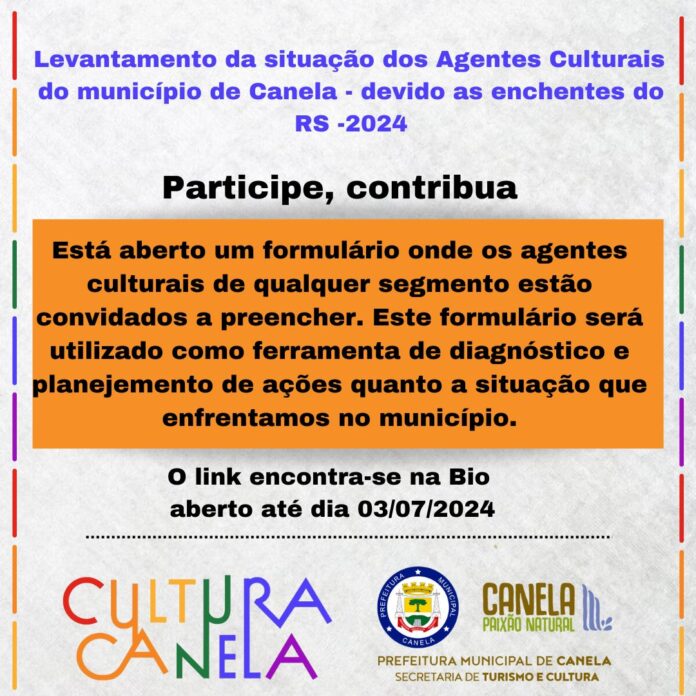 Em um esforço para avaliar e apoiar a comunidade cultural de Canela, a Secretaria de Turismo e Cultura, através do Departamento de Cultura, lançou um formulário intitulado “Levantamento da Situação dos Agentes Culturais do Município de Canela – Devido às Enchentes do RS 2024”. Este importante instrumento estará disponível para preenchimento até o dia 03 de julho e visa coletar informações essenciais para a formulação de medidas e políticas públicas que atendam às necessidades emergentes da classe cultural neste momento crítico.