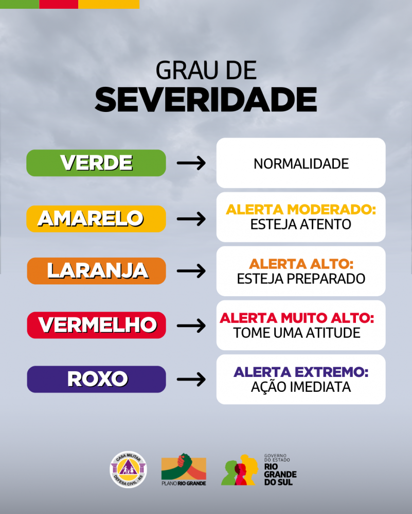 Em função das chuvas intensas previstas para o Rio Grande do Sul, com precipitações moderadas a altas em um curto espaço de tempo, é indicada a condição de Atenção e Alerta para as cidades em amarelo e laranja no mapa hidrológico, respectivamente, atentando para a elevação rápida com alto risco de cheias em arroios e pequenos rios, assim como enxurradas em regiões de maior declividade, além disso podem ocorrer fortes alagamentos em perímetros urbanos conforme a intensidade das chuvas.