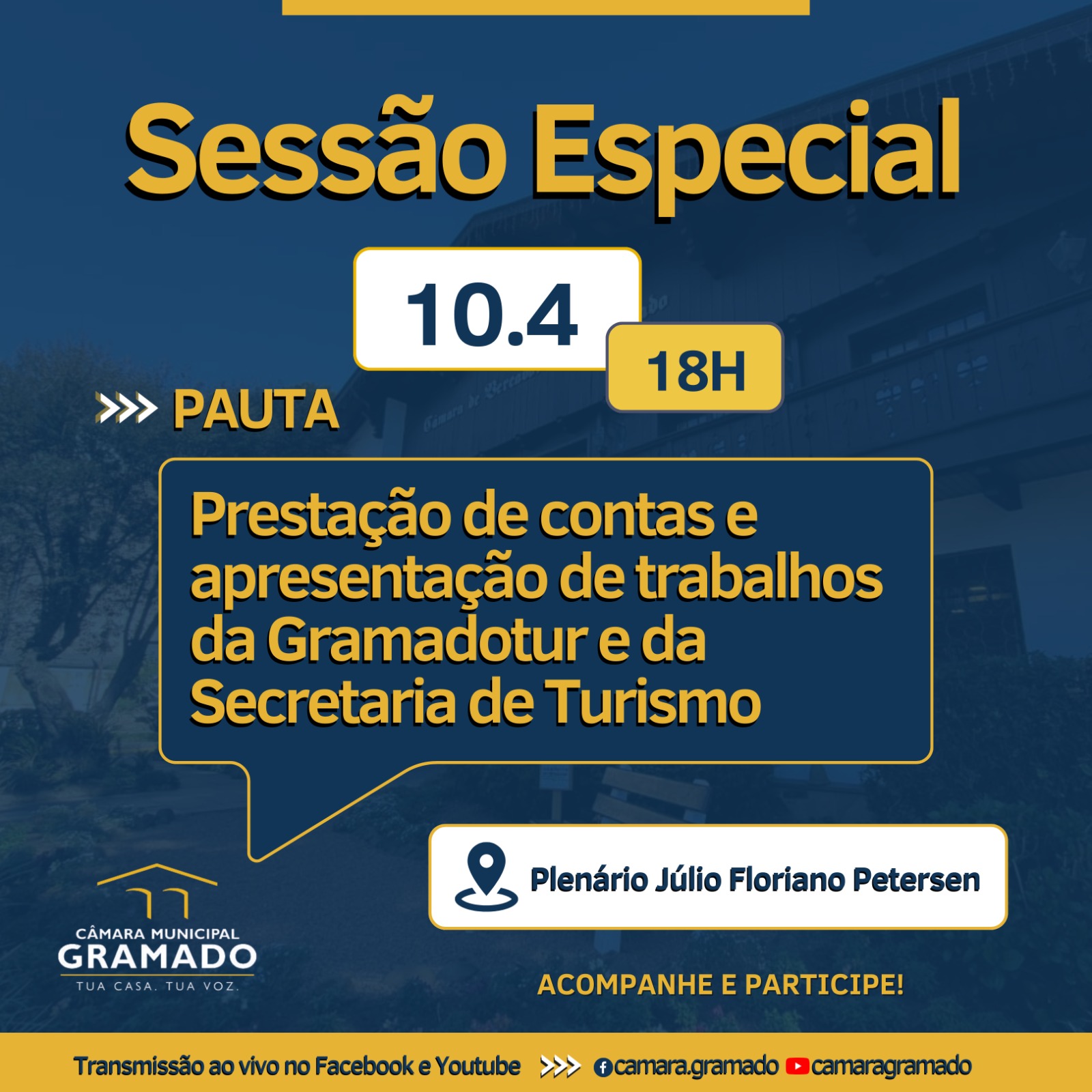 A presidente da autarquia, Rosa Helena Volk, também estará presente na ocasião apresentando os trabalhos desenvolvidos pela Gramadotur. A sessão começa às 18 horas e toda a comunidade está convidada a participar presencialmente no plenário Julio Floriano Petersen ou, ainda, pela transmissão ao vivo via Facebook e Youtube da Câmara.