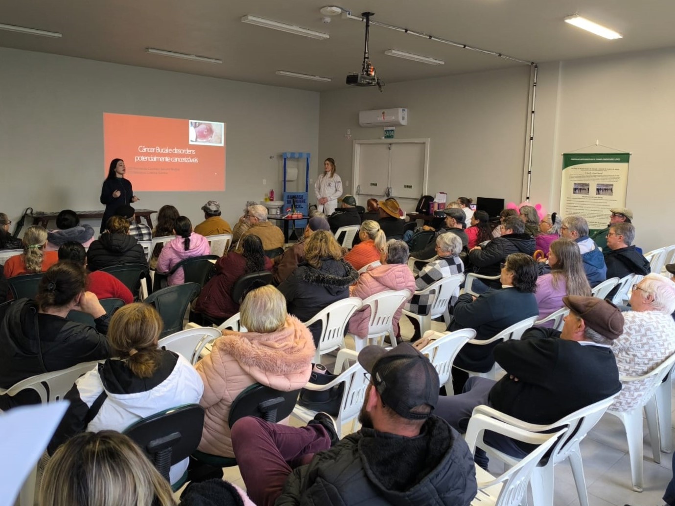 GRAMADO – A Secretaria da Saúde de Gramado, por meio da equipe da Unidade Básica de Saúde Carlos Altreiter Filho, da Várzea Grande, realizou na última quinta-feira (29) mais uma ação do grupo Hiperdia, voltada à prevenção e promoção da saúde. Nesta edição, o encontro abordou os cuidados com a saúde bucal, com foco especial na conscientização sobre o câncer de boca. A atividade foi conduzida pelas cirurgiãs-dentistas Fernanda Cardoso Severo Mattjie e Nathalya Cristina Santos da Rosa, que orientaram os participantes sobre sinais de alerta, prevenção e a importância do diagnóstico precoce.
