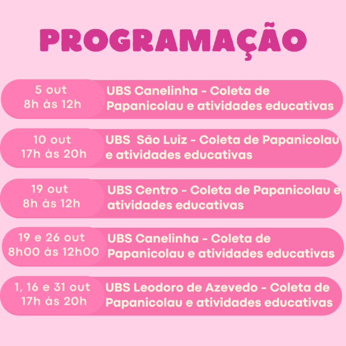 UBS São Luiz: A coleta de CP será realizada no dia 10/10, das 17h às 20h, com atividades educativas nas salas de espera. Além disso, todas as manhãs de quinta-feira do mês de outubro contarão com um turno extra para a realização de exames e orientações, buscando ampliar o acesso das mulheres aos serviços de saúde.