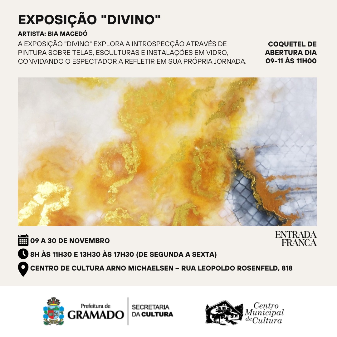 No próximo sábado (09), às 11h, o Centro de Cultura Arno Michaelsen abre a exposição “DIVINO”, da artista Bia Macedó. A mostra inclui 20 pinturas e 24 esculturas que reflem sua pesquisa em cor, materiais, texturas e transparências. As obras trazem uma provocação onde telas, vidros e metais conversam entre si e criam uma narrativa íntima que oferece uma experiência única de reflexão, convidando cada um a fazer uma viagem ao seu interior.