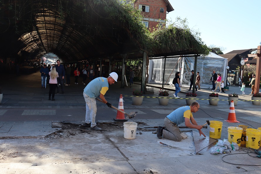GRAMADO – Com a proximidade do Festival de Cinema já é possível perceber movimentações para a realização de melhorias no entorno do Palácio dos Festivais. Através de uma iniciativa da Prefeitura de Gramado, a elevação da avenida Borges de Medeiros, na travessia da Rua Coberta para o Palácio, está recebendo um trabalho de reposição das pedras que estavam danificadas.