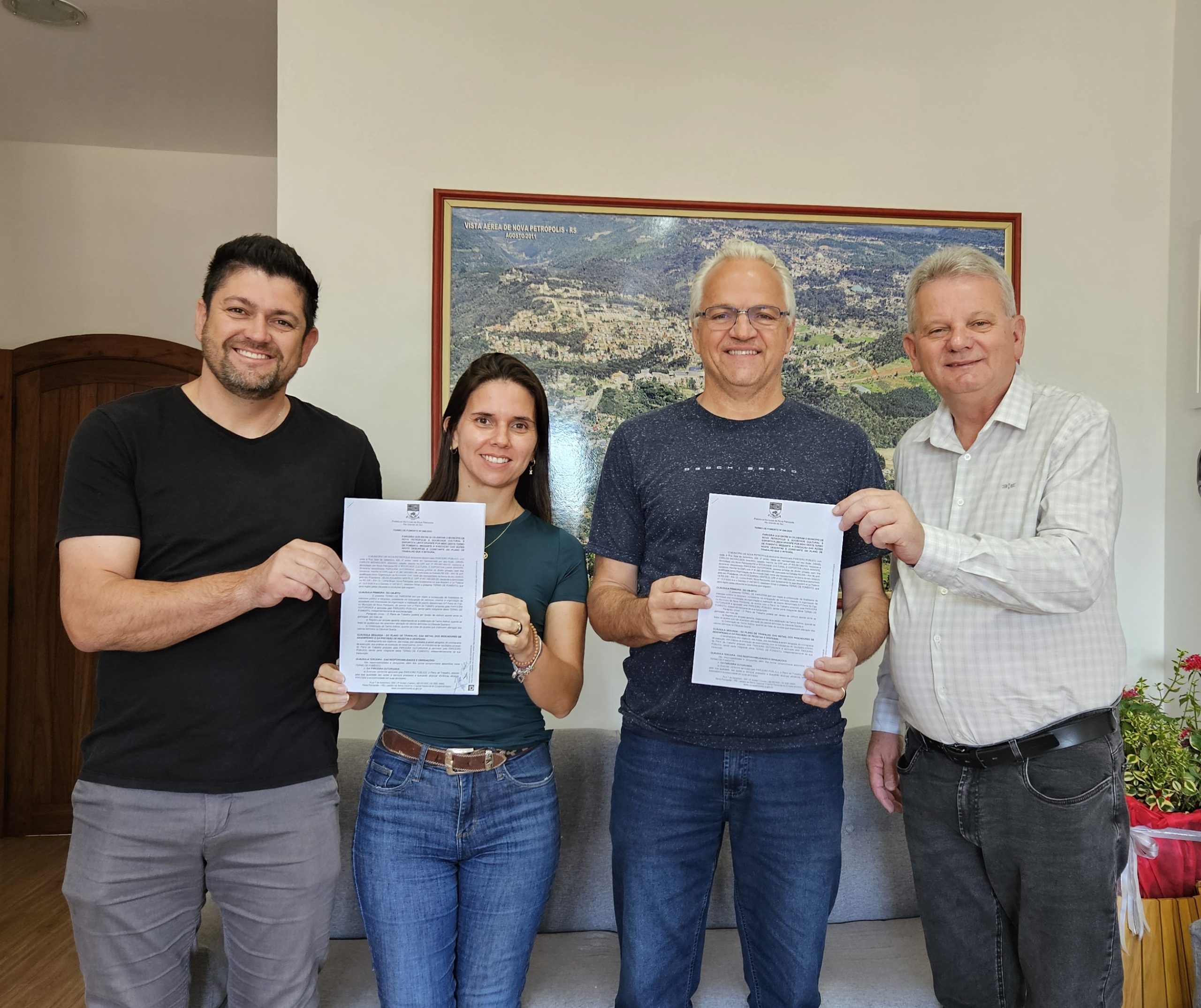 GRAMADO – O Poder Público Municipal e a Associação Cultural e Esportiva Linha Brasil firmaram termo de fomento nesta quinta-feira, 18 de dezembro, no Gabinete Oficial. O prefeito de Nova Petrópolis, Daniel Carlos Michaelsen, e o presidente da Associação, Celso Eduardo Seefeld, assinaram o termo que prevê o repasse financeiro de R$ 35 mil pelo Executivo Municipal. Os valores provenientes desta parceria serão investidos na realização da 51ª Festa do Figo de Nova Petrópolis. O vice-prefeito de Nova Petrópolis, Alexandre da Silva, e a secretária Municipal de Agricultura e Meio Ambiente, Denise Maltoni Bino, também participaram do ato de assinatura do documento.