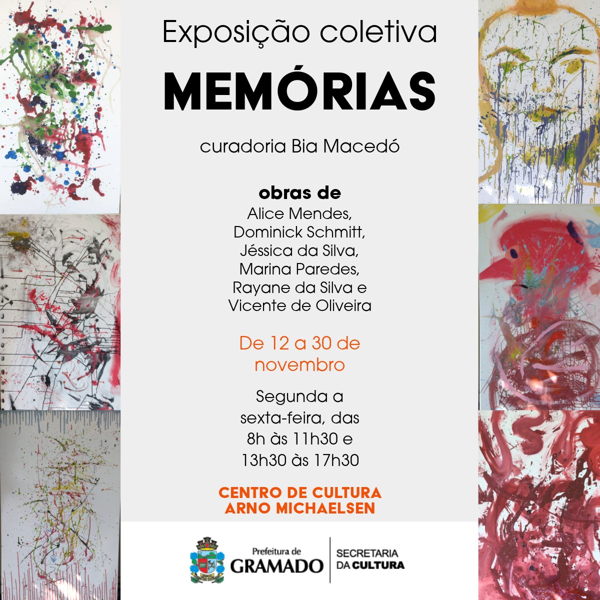 A partir da próxima terça-feira (12), o Centro Municipal de Cultura Arno Michaelsen recebe a exposição coletiva “Memórias”, com obras de alunos do Centro de Atenção Psicossocial de Gramado (CAPS): Dominick Schmitt, Jéssica da Silva, Alice Mendes, Rayane da Silva, Vicente de Oliveira e Marina Paredes. A orientação e curadoria é de Bia Macedó. A mostra inclui 22 pinturas, que refletem a busca de expressão dos sentimentos de acordo com as histórias e memórias de cada um dos alunos.