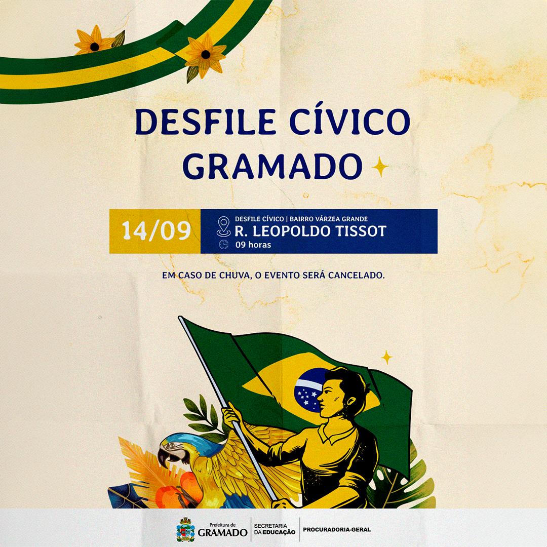A Administração Municipal de Gramado, por meio da Secretaria da Educação, informa que o Desfile Cívico da Várzea Grande está marcado para este sábado, dia 14 de setembro, a partir das 9 horas, na Rua Leopoldo Tissot. A concentração dos participantes acontece a partir das 8 horas, no complexo da Vila Olímpica, reunindo alunos de 12 escolas municipais, uma escola estadual e duas instituições de ensino privadas, além de integrantes de programas municipais e cinco entidades do município.