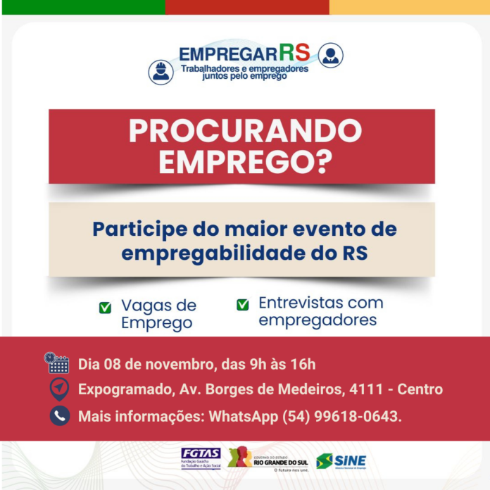 A Fundação Gaúcha do Trabalho e Ação Social (FGTAS/SINE), em parceria com a Prefeitura de Gramado, por meio da Secretaria Municipal de Inovação, Desenvolvimento Econômico e Relações Institucionais, promove no dia 08 de novembro, das 9h às 16h, a 9ª edição do EmpregarRS no Expogramado. O evento, que já beneficiou mais de 130 mil trabalhadores em todo o estado, é a maior feira de empregos do Rio Grande do Sul e representa uma oportunidade única para empresas gramadenses encontrarem os profissionais que precisam, e para os trabalhadores encontrarem novas oportunidades de emprego.