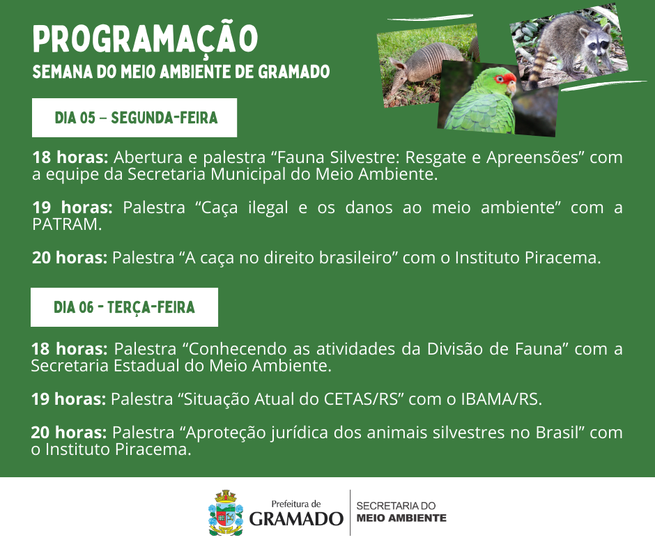 GRAMADO – A programação da Semana do Meio Ambiente de Gramado deste ano será repleta de palestras e conversas que destacam a fauna silvestre nativa, falando sobre a importância da preservação e do respeito aos animais que vivem na região. As atividades acontecerão na próxima segunda (05) e terça-feira (06), no Auditório da Prefeitura de Gramado, na Av. das Hortênsias, 2029 – Centro.