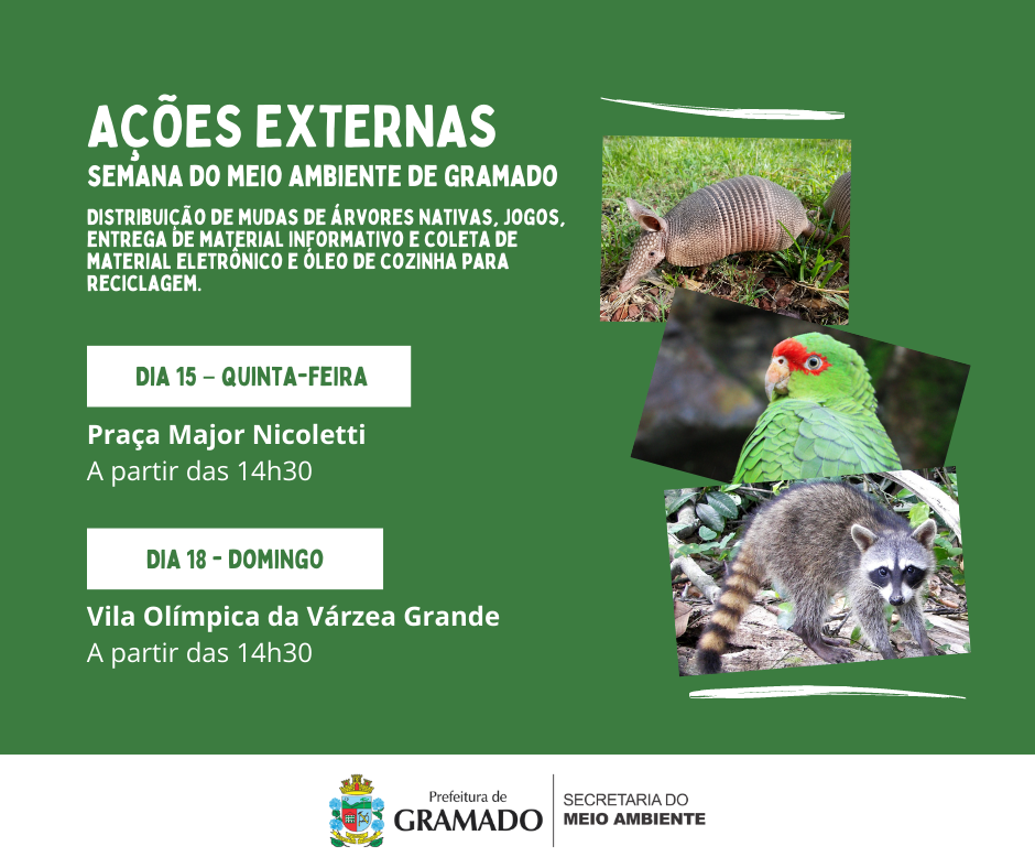 A Semana do Meio Ambiente também terá atividades no dia 15 de junho, na Praça Major Nicoletti, e no dia 18 de junho, na Vila Olímpica da Várzea Grande. Nestes dias, a partir das 14h30, haverá distribuição de mudas de árvores nativas e coleta de material eletrônico e óleo de cozinha para reciclagem.