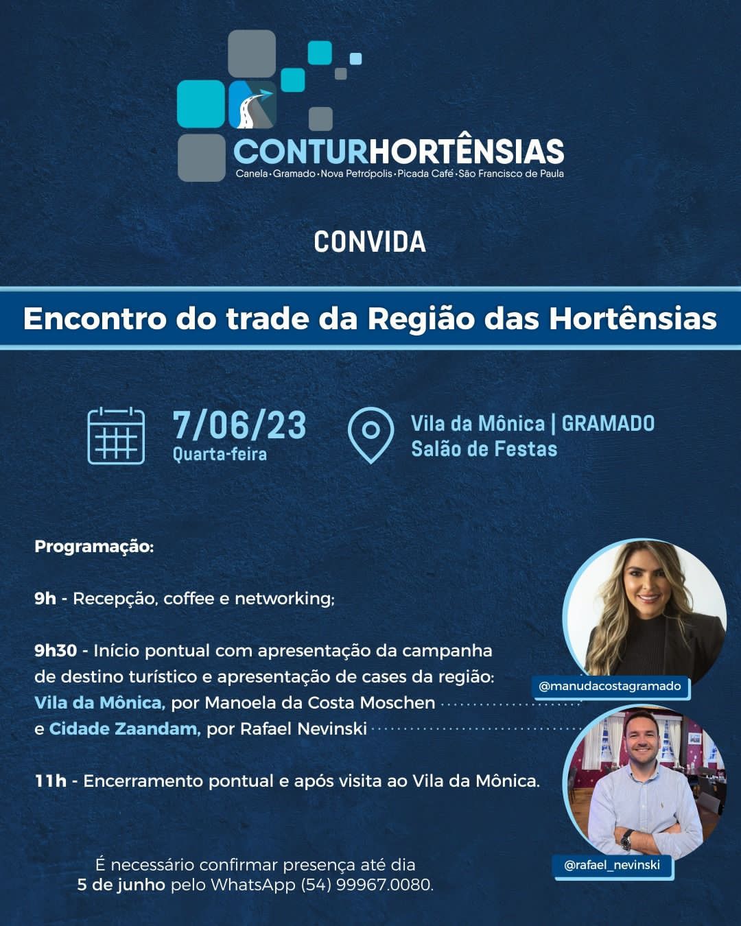 GRAMADO – No próximo dia 7 de junho acontece a reunião geral do Contur Hortênsias, que é realizada sistematicamente em cada um dos cinco municípios. Este encontro será diferente, contando com a apresentação de dois cases da região, o projeto Vila da Mônica, estabelecido em Gramado, e o projeto Zaandam, estabelecido em Nova Petrópolis.