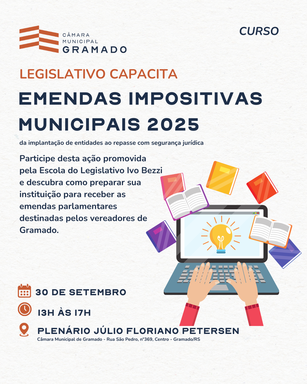 GRAMADO – Legislativo Capacita é um projeto da Câmara Municipal de Gramado, realizado por meio da Escola do Legislativo Ivo Bezzi, que tem como missão qualificar servidores públicos municipais — tanto do Legislativo quanto do Executivo — e, ao mesmo tempo, oferecer oportunidades de formação e cursos para toda a comunidade.